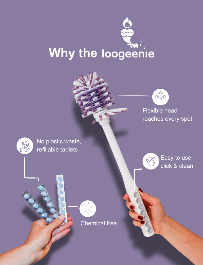 Forget plastic cleaning bottles and harsh chemicals. Loogeenie’s effervescent cleaning tablets are stored in the handle and released at the push of a button, giving you a sparkling, disinfected toilet—no extra sprays or gels needed.
